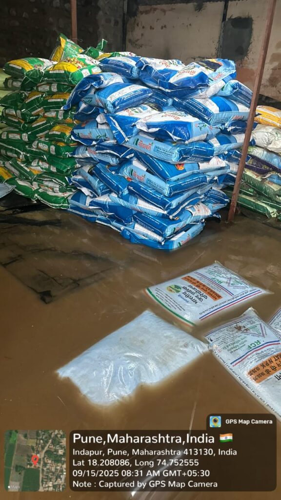 भिगवण: अकोले– (ता.इंदापूर) येथे रविवारी रात्री झालेल्या मुसळधार पावसाने अकोले परिसरातील खत विक्रेत्यांचे मोठ्या प्रमाणात नुकसान झाले आहे. अकोले येथील शेती उपयोगी औषधे व खते विक्री असलेल्या शुभम दराडे यांच्या अंकलेश्र्वर ऍग्रो एजन्सी या दुकानाचे मोठ्या प्रमाणात नुकसान झाले आहे.यामध्ये त्यांच्या दुकानात आणि साठवणूक केलेल्या गोडाऊन मध्ये पावसाचे मोठ्या प्रमाणात पाणी शिरल्याने अंदाजे २५ ते ३० लाखाचे नुकसान झाले आहे.यामध्ये मोठ्या प्रमाणात शेतीसाठी लागणारी १०-२६-२६ पोटॅश, अन्य पिकांसाठी लागणारी खते पावसाच्या पाण्यात तरंगत असल्याने मोठे नुकसान झाले आहे.दुकानात ही पाणी शिरल्याने शेतीची कीटकनाशके ,फवारणीसाठी तणनाशके यांचे नुकसान झाले आहे.यामुळे खत पुरवठा करणारी अन्य दुकाने व घरात पाणी शिरल्याने लोकांचे मोठ्या प्रमाणात नुकसान झाले आहे.त्यामुळे या झालेल्या पावसाने दुकानदार चिंतेत आहेत.या विक्रेत्यांची नुकसान भरपाई शासनाकडून मिळावी अशी मागणी नागरिकांकडून करण्यात येत आहे.