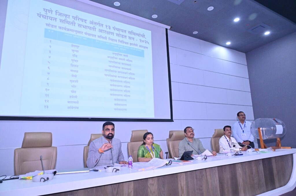 इंदापूर पंचायत समिती-अनुसूचित जाती, जुन्नर-अनुसूचित जमाती महिला, दौंड आणि पुरंदर-नागरिकांचा मागासवर्ग, शिरुर आणि मावळ-नागरिकांचा मागासवर्ग महिला, वेल्हे, मुळशी, भोर आणि खेड- सर्वसाधारण महिला, हवेली, बारामती आणि आंबेगाव- सर्वसाधारण याप्रमाणे आरक्षण जाहीर करण्यात आले आहे. यावेळी जि. प. प्राथमिक शाळेतील विद्यार्थ्यांच्या चिठ्ठी काढून आरक्षण जाहीर करण्यात आले. हे आरक्षण सभापती पदाकरिता सोडत अडीच वर्ष कालावधीकरिता असणार आहे.