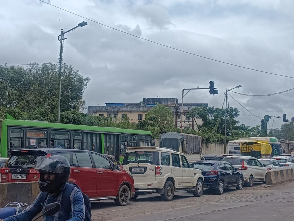 अगोदरच अरुंद रस्त्याने वाहनचालक हैराण झाले असताना दुसरीकडे अनेक व्यावसायिकांनी रस्त्यालगतच व्यवसायाची दुकाने थाटल्यामुळे येथे येणाऱ्या ग्राहकांच्या गोंधळात वाहनचालक फरफट ला गेला आहे.वाहतूक कोंडीतून मुक्तता व्हावी.यासाठी अनेक वाहनचालक हे अंतर्गत असलेल्या चव्हाण चाळीतील मार्गाचा वापर करत आहेत.मात्र या मार्गावर वाहनांची संख्या ही दिवसेदिवस वाढू लागल्याने भविष्यात होणाऱ्या अपघाताच्या भीतीने येथील स्थानिक नागरिकांनी दोन दिवसापूर्वीच हा मार्ग बंद केल्याने वाहनचालकांची इकडून आड तर तिकडून विहीर अशी बिकट स्थिती झाली असताना येथील नेहमीच होणाऱ्या वाहतूक कोंडीचे कोडे सोडविणे हे वाहतूक नियंत्रण कक्षात कार्यरत असलेल्या अधिकारी व कर्मचारी यांच्या समोर एकप्रकारचे आव्हानच उभे राहिले आहे.येथील उड्डाणपुलाचे काम पूर्ण होण्यास कमीत कमी दोन ते अडीच वर्षाचा कालावधी लागणार आहे.त्यामुळे स्थानिक नागरिकांना नेहमीच या कोंडीस सामोरे जाण्याची वेळ येत राहणार त्यामुळे काम सुरू करण्यापूर्वी येथील नागरिकांना पर्यायी मार्ग तरी उपलब्ध करून देणे गरजेचे असताना ते न करताच पुलाचे काम सुरू केल्याने नागरिकांमध्ये नाराजी पसरली आहे.तरी वाहनचालकांची नाही तर स्थानिक नागरिकांची मुख्य समस्या लक्षात घेऊन येथील होणाऱ्या वाहतूक कोंडीचा प्रश्न त्वरित मार्गी लावण्यात यावेत.अशी मागणी स्थानिक नागरिकांकडून होत आहे.
