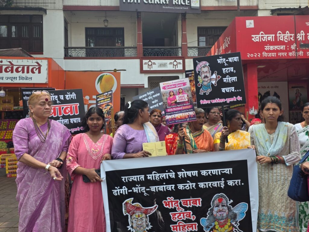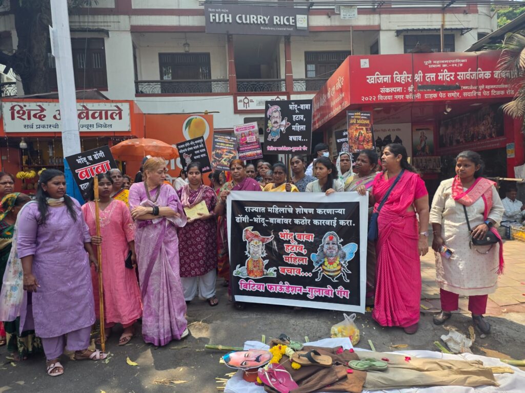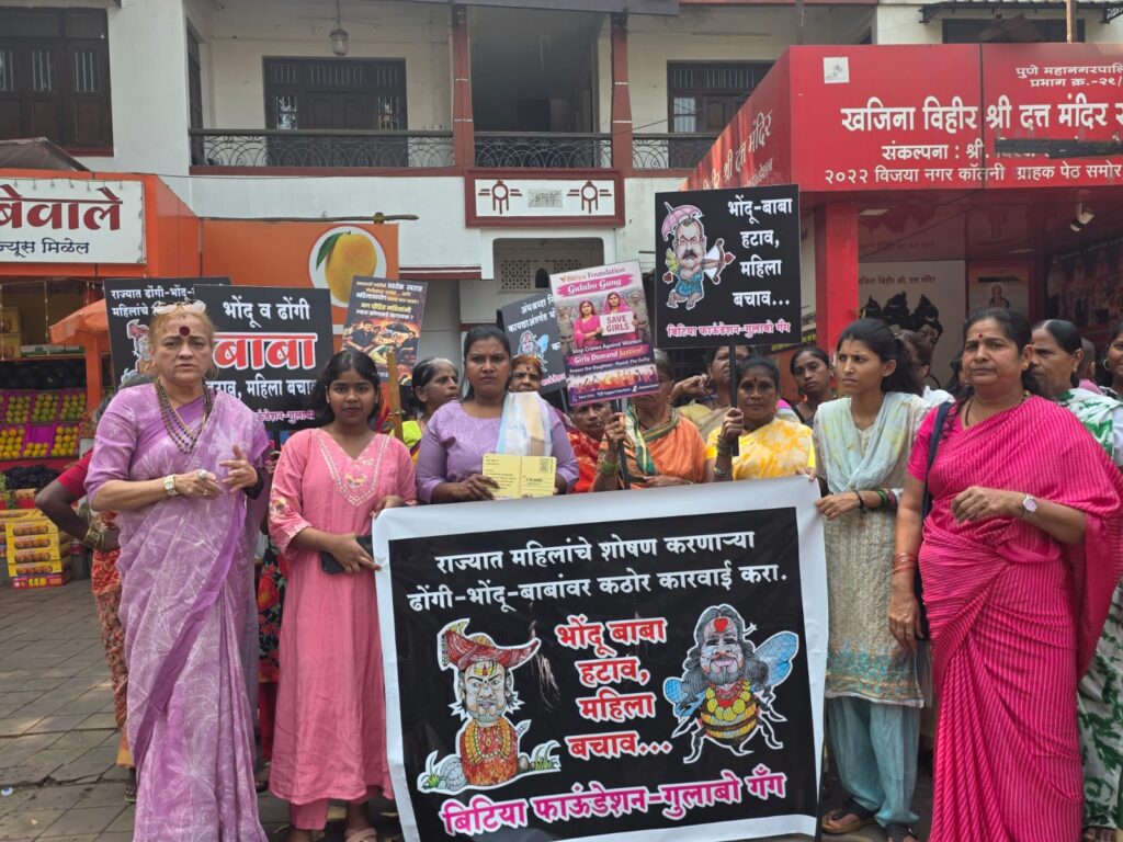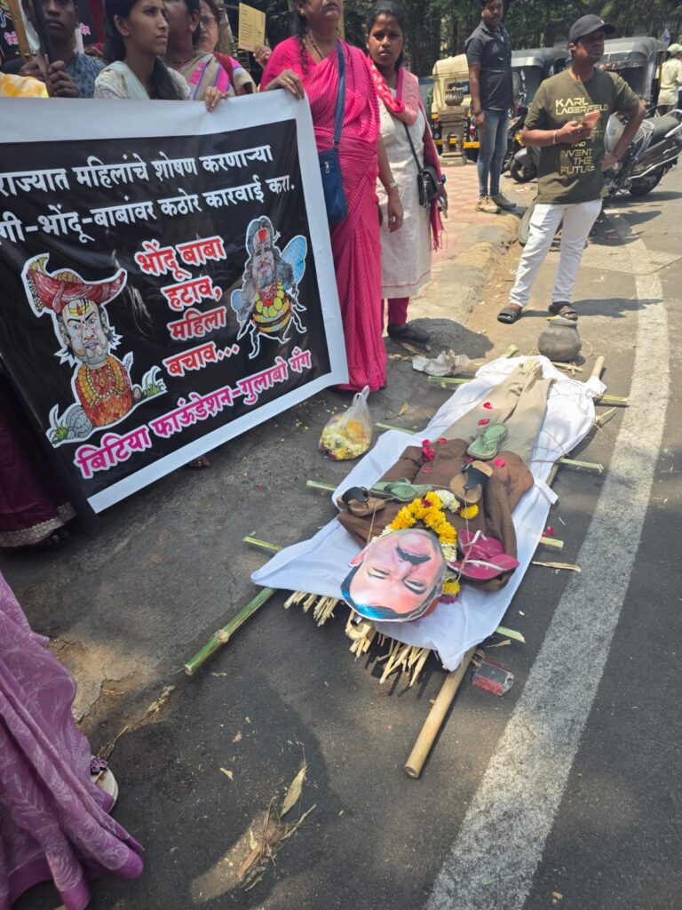 पुणे : एस.पी. कॉलेज चौकात आज गुलाबो गॅंगच्या वतीने भोंदू बाबा अशोक खरात याच्या विरोधात संतापजनक व आक्रमक प्रतिकात्मक तिरडी आंदोलन करण्यात आले. त्याला काळे फासले त्याच्या गळ्यात चपलांचा हार घातला आणि त्याला जोड्याने मारले महिलांची फसवणूक, अंधश्रद्धेच्या नावाखाली मानसिक आणि सामाजिक शोषण करणाऱ्या अशा भोंदू प्रवृत्तींचा आम्ही तीव्र निषेध करतो आणि सरकारला थेट इशारा देतो — आता कारवाई जलद गतीने झालीच पाहिजे , नाहीतर आंदोलन अधिक उग्र होईल! आम्ही महिला कोर्टात जाऊन त्या बलात्काऱ्याला भोंगळा करून मारू