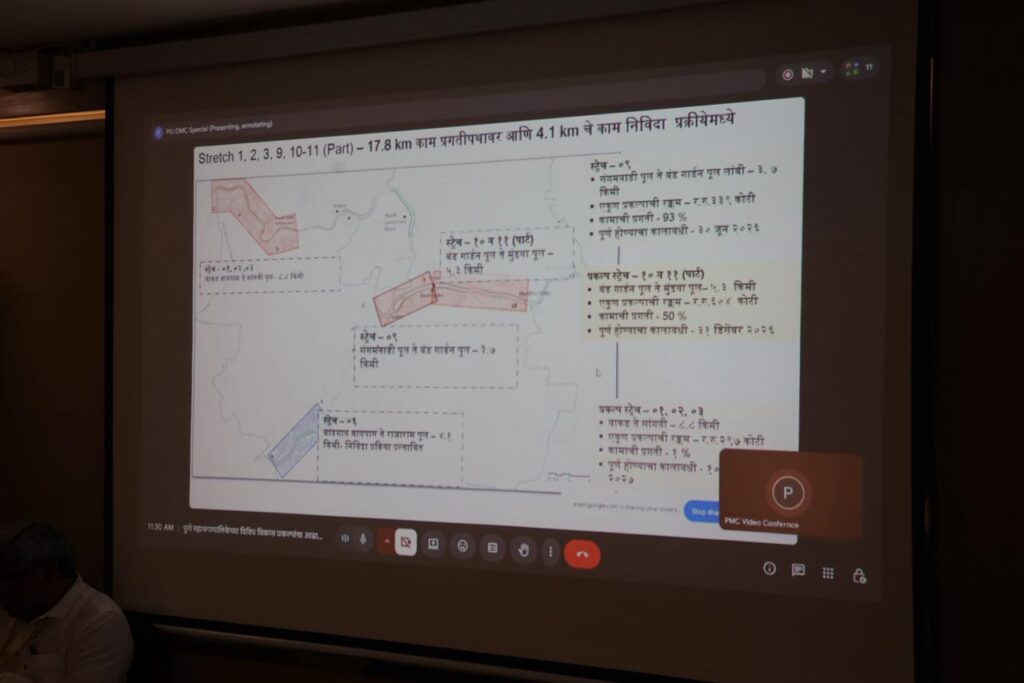 सदर आढावा बैठकीमध्ये मुळा-मुठा नदी पुनरुज्जीवन प्रकल्प (RFD), अमृत योजना, समाविष्ट ११ गावांचा विकास आराखडा (DP), मलनिःसारण प्रकल्प, पाणी प्रक्रिया प्रकल्प, रस्ते विकास प्रकल्प, प्रधानमंत्री आवास योजना व श्रम साफल्य योजना, पाणीपुरवठा योजना, पावसाळ्यापूर्वीची रस्त्यांची कामे व नाला सफाई, आपत्ती व्यवस्थापन, वाहतूक आराखडा, घनकचरा व्यवस्थापन तसेच नव्याने समाविष्ट २३ गावांमधील नागरी सुविधा (रस्ते, पाणी, सांडपाणी) आणि शाळा व रुग्णालयांचे आधुनिकीकरण व दर्जा सुधारणा या महत्त्वाच्या विषयांवर सविस्तर चर्चा करण्यात आली. यावेळी शहराच्या वाढत्या गरजांना अनुसरून प्रकल्पांची गती वाढवणे, नागरिकांना दर्जेदार सुविधा उपलब्ध करून देणे आणि आगामी पावसाळ्याच्या पार्श्वभूमीवर आवश्यक ती तयारी पूर्ण करणे यावर विशेष भर देण्यात आला. पुणेकरांना अधिक सक्षम पायाभूत सुविधा, सुयोग्य नियोजन, स्वच्छ व सुंदर शहर तसेच आधुनिक नागरी सुविधा उपलब्ध करून देण्यासाठी सुरू असलेल्या आणि आगामी विविध प्रकल्पांचा सविस्तर आढावा घेण्यात आला. यावेळी विकासकामांना अधिक वेग, गुणवत्ता आणि परिणामकारकता देण्यावर विशेष भर देण्यात आला.