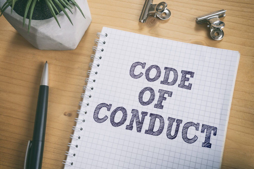 Code of Conduct text on notebook. Concept of ethical integrity, value and ethics.