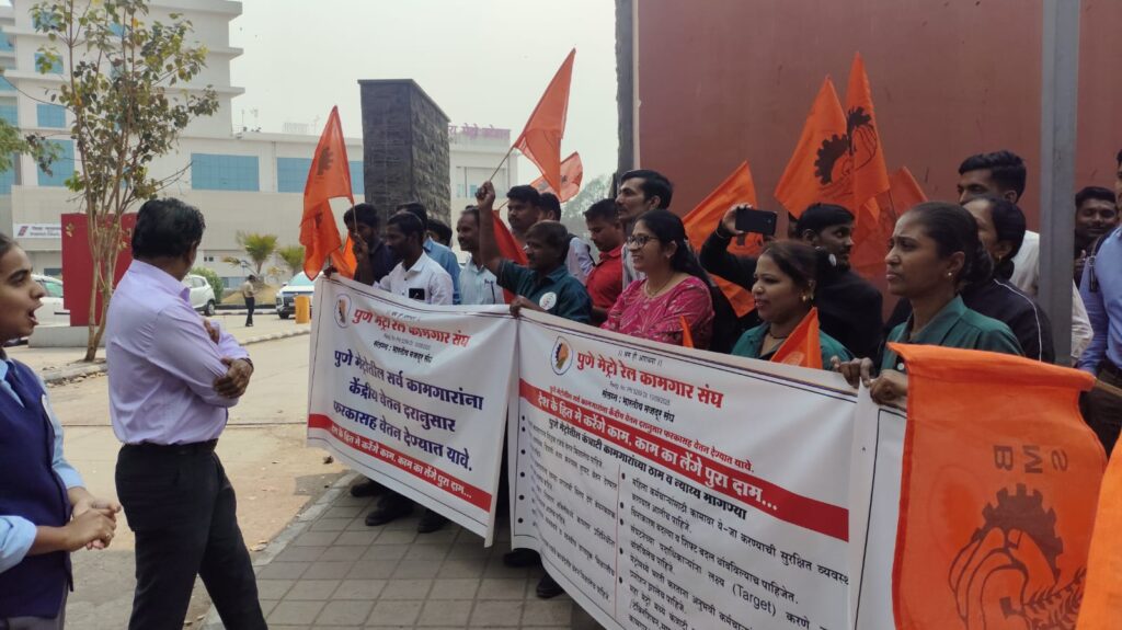 या पार्श्वभूमीवर पुणे मेट्रो रेल कामगार संघ (रजि. नं. पी.एन. 5299), संलग्न भारतीय मजदूर संघ यांच्या वतीने पुणे मेट्रोतील सर्व कंत्राटी कामगारांच्या न्याय्य मागण्यांसाठी लाक्षणिक धरणा आंदोलन मेट्रो प्रशासना कार्यालय येथे करण्यात आले . या आंदोलनात अखिल भारतीय ठेका मजदूर महासंघ सरचिटणीस (भारतीय मजदूर संघ) सचिन मेंगाळे यांनी मार्गदर्शन करताना ” महाराष्ट्र सरकार चा दि 18 /02/2025 चा शासन निर्णय तात्काळ अंमलात आणण्यात येवुन सर्व कामगारांना केंद्रीय वेतन दरानुसार लाभ देण्यात यावा अशी ठाम मागणी करण्यात आली आहे .